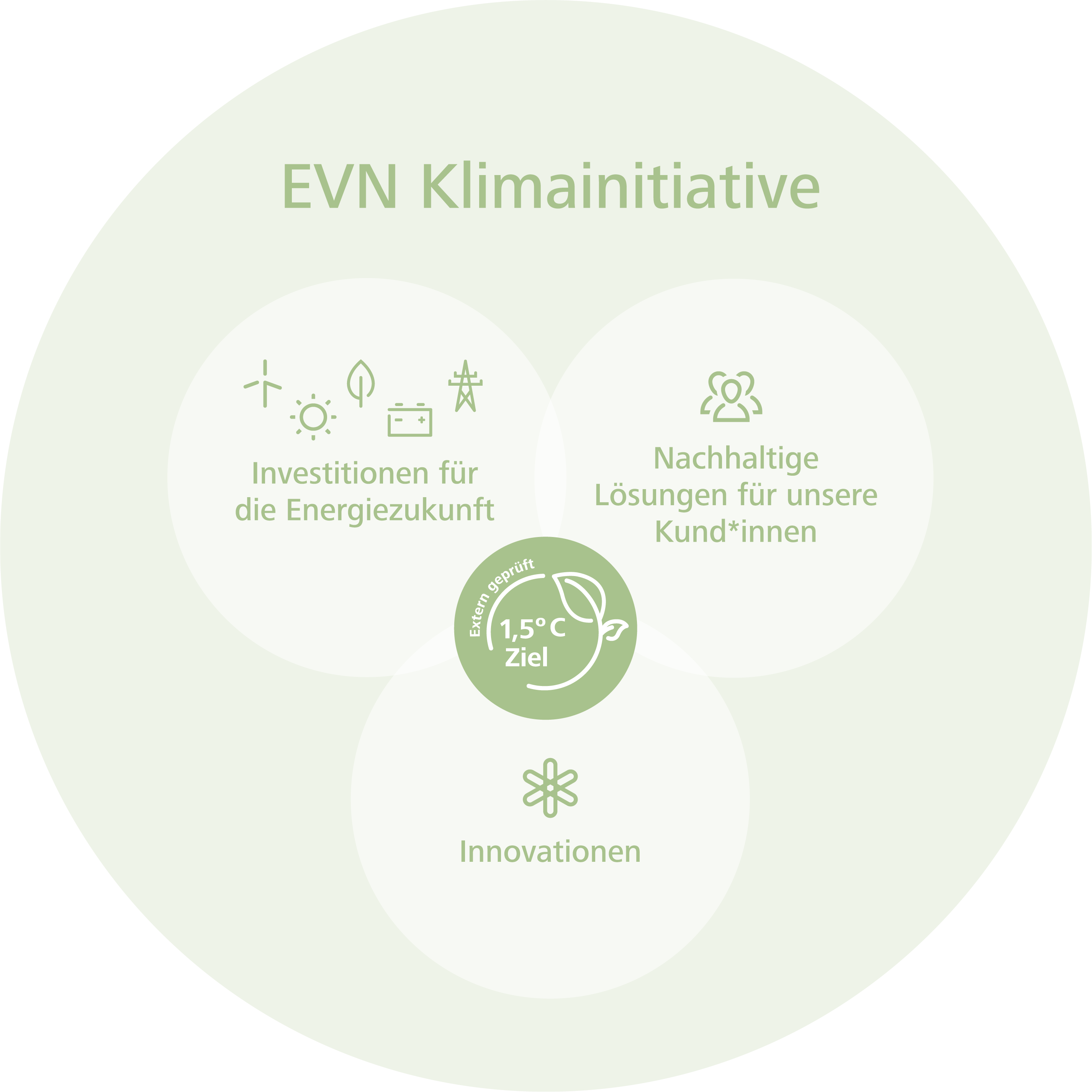 Die EVN Klimainitiative ist Teil unserer Kernstrategie 2030. Sie repräsentiert unseren 1,5°C-Übergangsplan zur Dekarbonisierung unseres Unternehmens. Mit dem Ausbau unserer erneuerbaren Erzeugungskapazitäten und der erneuerbaren Wärmeversorgung bündelt sie einerseits unsere Investitionen für die Energiezukunft. Sie schließt aber auch unsere Kund*innen mit ein, für die wir durch die Versorgung mit erneuerbarem Strom und Wärme nachhaltige Lösungen schaffen. Die gezielte Entwicklung und der Einsatz von innovativen Produkten z. B. im Bereich des Flexibilitätsmanagements sowie digitale Kund*innenlösungen für Prosumer ergänzen und ermöglichen diese Initiativen.
